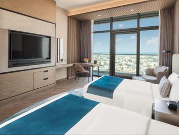 Уровень сервиса слабоват для пятизвездочного отеля. - За день до заезда начали пытаться списать деньги с карты, хотя оплата указана при заезде. Было неприятно каждый 3 часа получать сообщения от букинг с угрозами отмены. - Ресепшен находится на 14 этаже, там же пересадка на лифт до бассейна на 64 этаже. Потоки новых постояльцев пересекаются с людьми идущих в мокрых купальниках через парадный холл. - Бассейн работает лишь до 20 часов (8 p.m), без 5 минут 8 всех выгнали из бассейна и сразу же отобрали полотенца, не дав даже немного подсохнуть. (Что на мой взгляд неприемлемо). Непонятно почему бассейн закрывается так рано, учитывая что ресторан вокруг бассейна продолжает работу, вода теплая при такой жаре. - В одно из посещений бассейна на крыше началась пожарная тревога. При вызове лифта мы увидели значок пламени на табло, после чего сильно зашумела вентиляция, все лифты остановились, нас попросили выйти обратно к бассейну. Персонал запаниковал, роняли телефоны, все напугались. После, когда тревога оказалась ложной, персонал захохотал и продолжили работать как ни в чем не бывало. Никто даже не подумал объяснить толпе людей что происходит и как-то объяснить ситуацию. Персоналу не хватает компетенций чтобы отвечать за безопасность людей и обеспечивать комфортное пребывание. - В номере были проблемы с водой. Сантехника хоть и красивая, дизайнерская, но работала ужасно. Переключить лейку на тропический душ у меня не хватило сил. Настраивать воду тоже тяжело. При этом температура постоянно разная. С утра в один день текла только горячая вода, а вечером только холодная. - На завтраках не было чая, его нужно было отдельно заказывать. ( надо отметить что сотрудники на завтраках были очень любезны и приносили чай по первой просьбе) - Кондиционер не очень справляется с июньской жарой - По экологическим соображениям в номерах выдают многоразовые тапочки, дополнительные принадлежности дают по запросу. - При выезде никто не провожал, чемоданы пришлось самим грузить в такси