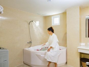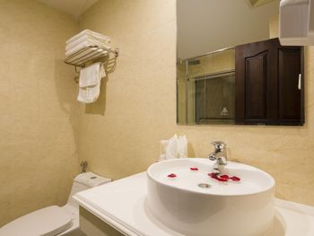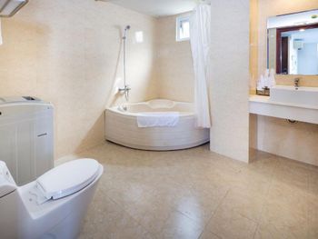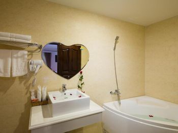 Фотографии не соответствует действительности. Ванные комнаты - это инфаркт плиточника. Грязные, старые ванны, герметиком нигде не промазаны - поэтому всегда после мытья потоп. Между ванной комнатой и основной есть окно, шторка на этом окне уже с чёрной плесенью (и так во всех номерах, у нас было 3 номера).