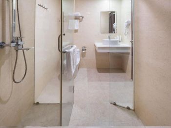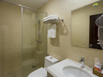 В ванной как бы ты ни мылся - вечная лужа воды. Принцип работы нагревателя мы так и не поняли - через раз вода шла холодная. Номер объективно уставший. Возле кровати со стороны ванной пахнет унитазом (!)