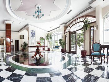 Интерьеры отеля устарели. В том числе кондиционер, который плохо справлялся с жарой. Часть лампочек не работали, дверцы шкафа не закрывались полностью. Ночью довольно шумно, т.к. перед окнами дорога, мы использовали беруши. Довольно навязчиво предлагали услуги массажа.