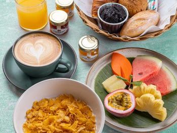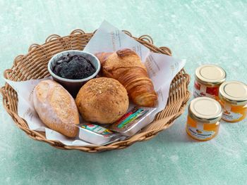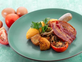 Были варенные яйца , глазунья и делали омлеты и панкеки . Был жаренный бекон . Огурцы помидоры чери и листья салата. Фрукты, соки , корнфлекс, супы и рис с овощами. Иногда были обжаренные овощи . Сосиски куринные и свинные. В общем выбор был. Но каждый день одно и то же.