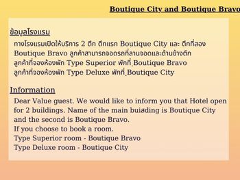 Останавливаемся уже не в первый раз в этом отеле. Местоположение удачное, в 10 минутах от Волкинстрит, рядом ряды с едой и фруктами. Тукком (тц где продают электронику) в 2 минутах ходьбы. Отель больше направлен на туристов из Китая. Но не смотря на это было тихо. Бассейн на 4 этаже, завтраки норм для не прихотливых. На ресепшене только английский, но английский по тайски- ничего не понятно. Благо существует Гугл переводчик. Мы Попросили оставить чемодан на неделю пока путешествовали по островам -нам отказали, Хотя возвращались в Бутик и продолжали там отдыхать. Вот это было не осень приятно.