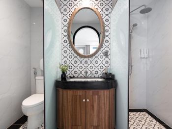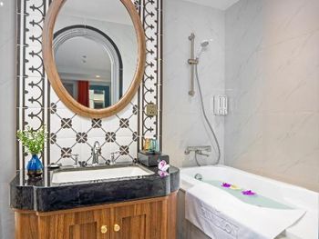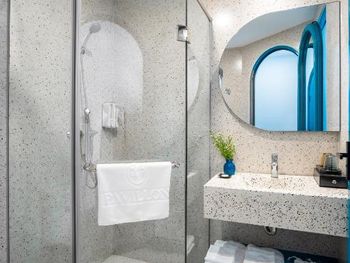Номера с ванной комнатой не берите! Очень странно сделана ванная, вся вода попадает на пол и образуется бассейн, да там есть слив на полу, но вода долго не уходит и поэтому приходится постоянно когда посещаешь туалет или раковину ногами вставать в лужу. Мылись на корточках, чтобы хоть как-то минимизировать. Еще сама ванная очень высокая, есть вероятность залезая в нее подскользнуться. Сказали на ресепшен, но нам никак не помогли. Если бы они хотя бы повесили шторку, это бы решило проблему. Если вы привезете свою шторку, это никак не поможет, так как крепить не на что. Шампунь и гель для душа у них есть в дозаторе, но странного качества, мало пенились и запах не вкусный, так что покупайте сами.