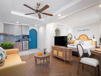 Хорошее расположение, пара минут и вы на пляже. Но при этом имейте ввиду, что до центра Нячанга придется идти минут 25. Номер точно такой же как на фотографиях, просторный. Для кухни все выдают, плиту, сковородку, кастрюли, все приборы. В номере работал холодильник, чайник, микроволновка. По нашей просьбе дали дополнительный стул. Да вещи сушить негде, но мы об этом знали и из России привезли веревку с прищепками. Вид на море-это море 50%, половина с одной стороны, по центру стоит отель и половина с другой стороны. Не думайте что есть номера с другим видом, нет там все номера так расположены. Нам повезло и был тихий кондиционер, у друзей что были ниже этажом кондиционер шумел очень сильно. Было два балкона, один большой, но для балкона не было стола и стульев, мы сами при необходимости выносили из номера, чтобы посидеть. Каждый день выдавали две бутылки воды, два пакетика чая и кофе. Если что-то заканчивалось, можно попросить на ресепшене. Вай фай работал исправно. Рядом с отелем много недорогих кафе где можно покушать, недалеко находится автобусная остановка и ювелирный магазин с хорошим курсом обмена и сами украшения по доступным ценам.