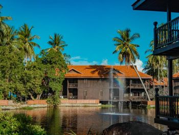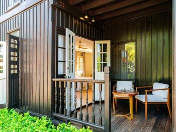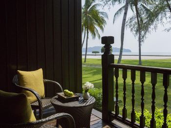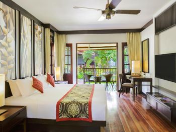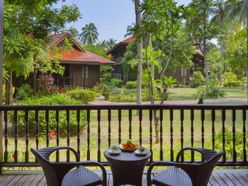 Зелёная большая территория отеля, шале в малайском стиле, белоснежный пляж, вкусные завтраки.