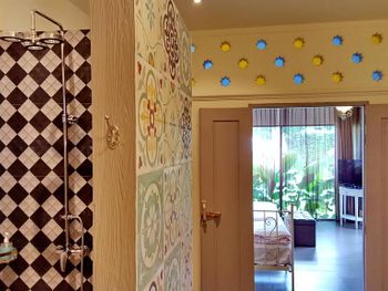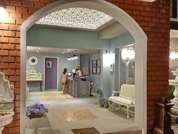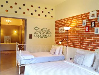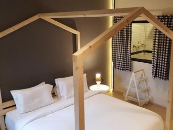 Очень уютный отель с зелёной, украшенной разными статуэтками территорией. Есть детский уголок, есть бассейн. В номере было чисто, уютно. Две бутылочки воды, чай/кофе/сахар. Места для размещения вещей очень мало. Шкафа или тумбочки нет, есть пара вешалок в открытом доступе. Скрипела кровать и от соседей какие-то скрины и стуки раздавались весь вечер. Это напрягало.