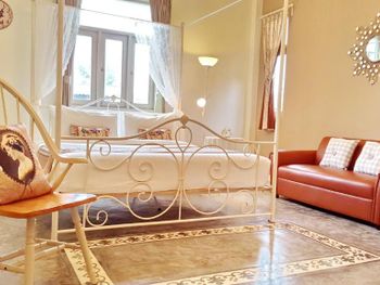 Оформление номеров в стиле прованс, есть чайник, кофе, чай и сахар (нет халатов и тапочек).