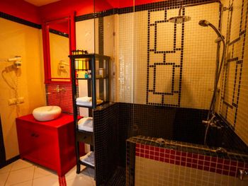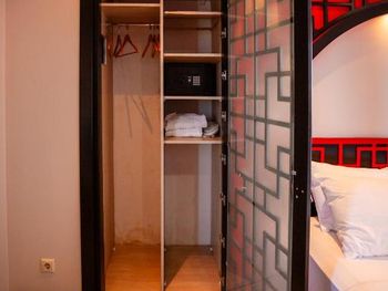 Не соответствие интерьера в стиле поп арт с экстерьером, много красного цвета и изображение больших черных ладоней в номере даже немного пугает. Мебель пожелтевшая от времени, изголовье кровати затертое, прикроватная тумба с одной стороны. Ощущение, что отель в несезон не работает, а существует. На ресепшене никого, нужно идти в другое здание, ключ не открывает номер, нужно опять идти на ресепшен, жуткий холод, не работает ни один отопительный прибор в декабре. Но оказалось, сами виноваты, что всё не включили. В моем представлении номер готовят к приезду гостей. Мы рано уезжали, хотели взять завтрак с собой. Мужчина, который включал нам всё отопление, сказал, что не нужно идти на ресепшен, он сам всё передаст. В итоге в 7 утра в ресторане никто не знал про наш завтрак, на ресепшене, как всегда никого. Ну и будьте готовы, что каждый час будет звон часов в башне, в которой вы живете.