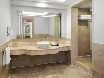 Халаты принесли только по требованию. Сами брали зубной и бритвенный набор с тележки уборщика. В номере этого не было. Питание не понравилось. Ходишь из ресторана в ресторан в поисках того, что можно съесть. Готовят как-то не аппетитно. На обед и ужин жарят гриль, но все мясо сухое. Очень сильно отравились с поносом, температурой и рвотой. Может это и от бассейнов? В общении с другими выяснилось, что мы не одни такие. В бассейны лезть не советуют все. Обязательно везите лекарства.