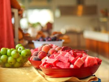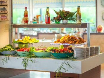 Разнообразный шведский стол, на балконе есть вешалка для полотенец, столик, пляжные полотенца меняют каждый день, нам презентовали бутылку местного вина и фруктовую тарелку.