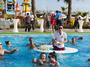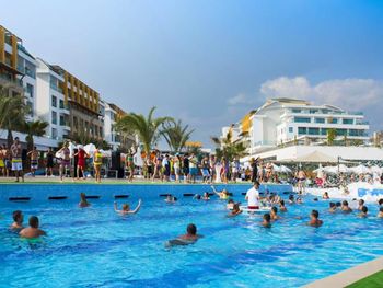 Пляж. Отель большой, лежаков не хватает, один душ на здоровый отель. Не понравилась анимация - на гигантское количество народу мест не хватает. В итоге, дети сидят на шеях, никому ничего не видно. Детская дискотека - толпа взрослых, дети между ног у них там типа танцуют.