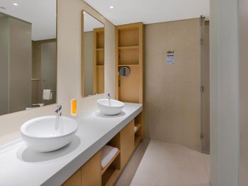 Дырявый душ: как ни мойся, всё равно весь пол мокрый. Дырявые окна: когда пошел дождь - вся вода была в номере. Вид из окна на электростанцию так себе красота. Отсутствие сушилок для одежды: обычная хлопковая одежда (трусы и носки) сохли двое суток в номере при включенном кондиционере.