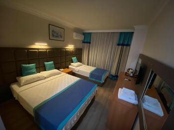 Отель находится в удачном месте, в пешей доступности от городских пляжей, ресторанов, парка, тц, остановок транспорта. Хороший городской отель за приемлемую стоимость, собственного пляжа нет, рядом находятся как платные бичклабы, так и городской бесплатный пляж (все пляжи в этом районе - на платформе), море прозрачное, т.к. есть подводные пресные течения вода в море прохладнее чем на побережье, местами холодное. В отеле есть два бассейна, во время нашего пребывания наполнен был один в здании на -1 этаже. Не купались, все таки не совсем ясно зачем он там нужен в подвале, без солнца, возможно в зимнее время подогревается. Номер был для троих (одна двуспальная и односпальная кровати) небольшой, втроем тесновато, места даже для чемоданов особо нет, балкон хороший, можно вечером посидеть. Ванна небольшая, душевая кабина маленькая. Кондиционер включали пару раз, при включении пахнет сыростью и затхлостью (не уверена, что его обслуживают в срок). Завтрак для перекусить вполне. Рекомендую как городской отель для остановки в Анталии на пару-тройку дней, погулять, покататься, приходить только вечером спать. Отдельная благодарность нашему патрону! лояльный, отзывчивый персонал.