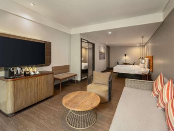 Насладитесь великолепным сервисом в Pullman Bali Legian BeachМы работаем над переводом этого описания на ваш язык. Приносим извинения за неудобства.Located in midst of Legian and Kuta beaches, the 5-star Pullman Bali Legian Beach boasts a spa, 1 lagoon-shaped garden pool at the first floor, 1 adult-only infinity pool on the 3rd floor, a PullmanFIT, and a kids\' club. The resort is 15 minutes\' walk from the famous Beachwalk Shopping Center. The resort is officially certified sustainable from Green Globe certification and certified for HACCP food safety by the EHC (Environmental Health Consultancy).