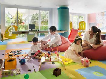Хорошая детская комната, много игрушек и внимательные нянички.