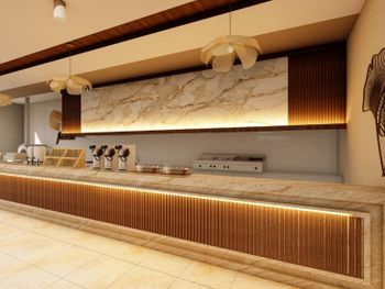 еда не всегда свежая. все колбасы и сосиски красные. сыры бывают засохшие. детская игровая комната в ремонте, хотя она была включена в стоимость. обслуживание столиков не понравилось. не дождаться официанта или элементарно убрать со стола после предыдущих гостей. и самоё ужасное это номер с видом на море, но к сожалению с таким шумом от трассы, просто невозможно было спать.