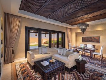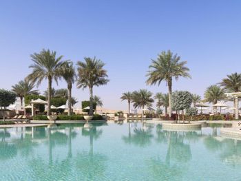 Безусловно, отель сам по себе выглядит потрясающе. Навивает мысли о сказке про Аладина. Отель похож на замок в пустыне, располагается на оазисе. Территория отеля огромная и охраняемая. В отеле своя инфраструктура. Они занимаются разведением верблюдов, лошадей, соколов, собак породы салюки. Естественно всю эту живность вы можете посмотреть, потрогать, покататься за определенную плату. Цена на такие развлечения удовлетворительная. Все вы можете забронировать на стойке около рецепшена. Единственное, на лошадях и верблюдах прогулка в 6:30 утра. Мы катались и не чуть не пожалели. С утра заряжаешься бодростью. Питание на завтраках по-арабски пышное. Всего достаточно по сравнению с другими отелями в ОАЭ. Все вы сможете найти от сыров до десертов. Конечно омаров и лобстеров нет, но и атмосфера к этому не предрасполагает. В обед посетили ресторан у бассейна. Ресторан Средиземноморский. Цена удовлетворительная, еда очень понравилась. Обслуживание хорошое. Мы проживали ночь в номере и ночь на вилле. Номер по нашему мнению оказался лучше по важному нам критерию - приватность. В номере очень чисто, свежее постельное белье. Шикарная ванна. Размера на двоих хватает. Приятный балкон с потрясающим видом на пустыню. Конечно вилла сама по себе больше, распологает гостиной, спальней, обеденной зоной, мини-кухней, большой ванной с двумя умывальниками, террасой с бассейном, шезлонгами. Но так как выход на террасу оснабжен стеклянными дверьми в пол, то вашу голою попу будет видно соседям на против, если вы не задвигаете шторы. Так же не исключено, что Ваша вилла будет достаточно далеко от рецепшена и ресторанов и добраться пешком до туда вы просто не сможете. Придётся вызывать машину для гольфа с рецепшена. Это бесплатно и довезут вас куда угодно. Скажем цена за виллу частично оплавлена. Подходит для путешествия с детьми. По моему личному мнению отель сравнительно дорогой и оправдывает свою цену. Конечно некоторые моменты должны быть улучшены, но в целом все потрясающе!