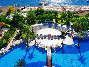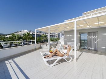 Специально брал номера с видом на море, т.к. на три недели и хотелось насладиться видом тоже. Формально балконы выходили в сторону моря, но оно наполовину было закрыто крылом здания, а другая половина терялась за пальмами. За три недели ни дети, ни взрослые не проявили интереса к такому "виду на море". Явно переплаченная зря опция. Отношение к россиянам явно испорченное, в приоритете из других русскоговорящих стран СНГ и Прибалтики, особенно много из Украины (видимо, связано что то на государственном уровне). Конфликтов на этой почве ни каких не было у нас, но впервые столкнулся в Турции с нежелательностью видеть в отеле россиян. Открытого неприятия нет, но какое то ощущение, что не совсем желанные гости. Цены на все явно завышены (может из-за закрытия сезона: были с 3 по 23 августа включительно). Уборка как то странно происходила. Уборщицы приходили не когда вам удобно, а когда ей. Если вы не пустили в удобное ей время, то уборки не будет. А приходила она к нам сразу после завтрака, когда мы с детьми собирались на выход и нам буквально минут 10-15 нужно было еще. На четвертый день без уборки и смены полотенец пришлось на ресепшене уже просить как-нибудь хоть уберитесь. Вообще там почти все надо ходить просить, правда, не все просьбы вам удовлетворят. Например, набор принадлежностей в ванной в полном составе мы видели только в первый день. Потом несмотря на напоминания, все равно не клали все, что было (не думаю, что ушные палочки в количестве 6 шт. на 5 человек были рассчитаны на все 20 дней). Вай-фая бесплатного там можно сказать нет, эта опция у них в описании ложная. Первые дни мы подходили, что уже вырубли нам вай фай. Говорили, что лимит, потом, что ошибочно подключили только 10 дней, хотя у нас 20, потом, что мы использовали весь лимит (два человека из 5 вообще, к слову, им не пользовались, но почему то у всех одновременно лимит закончился). Когда объясняешься по доступу в интернет на ресепшене перестают понимать по русски.