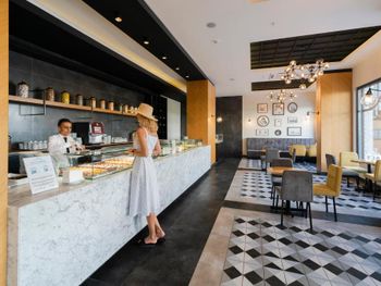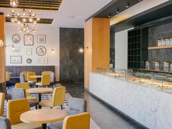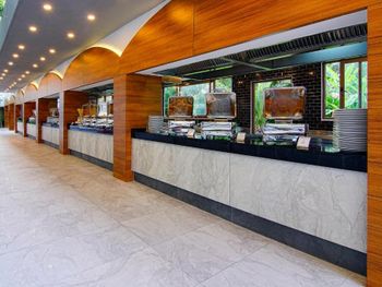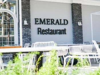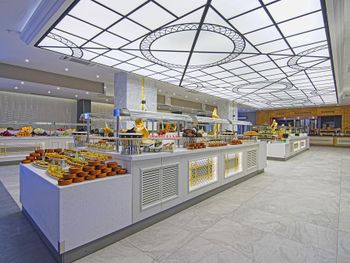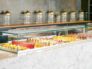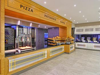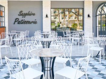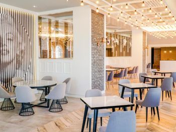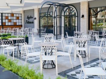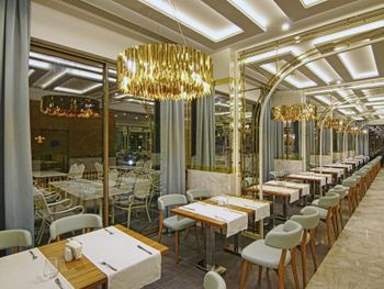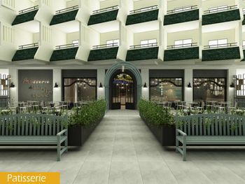 У отеля красивая территория, много зелени и мест для отдыха. Красиво оформлен зал для еды, есть своя кондитерская.