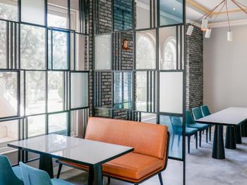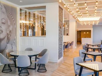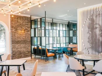 У отеля красивая территория, много зелени и мест для отдыха. Красиво оформлен зал для еды, есть своя кондитерская.