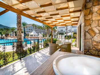 Мы брали номер с террасой и джакузи, что бы иметь возможность проводить там время и в непогоду, и для того, что бы ребенок мог там ползать (7 месяцев). Как оказалось, навес террасы не защищал от дождя, а пол терассы не убирался на протяжении всего нашего отдыха.