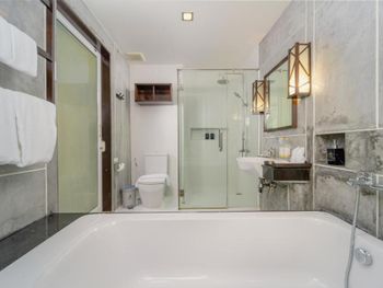 В делюксах хорошие санузлы с ванной и нормальным душем.