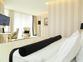 Мебель в номере уже весьма не новая. В номер принесли чай, кофе, но чайника не было, когда попросили сказали сейчас принесут, но так и не принесли. Халатов в номере не было, хотя 4 звезды обычно предполагают наличие халатов. При бронировании был выбран угловой номер с балконом, но при заселении пришлось повторно просить чтобы номер был с балконом. В итоге дали просто люкс с балконом