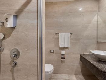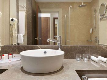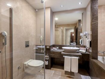 Также удивило, что в номере очень мало гигиенических принадлежностей обычных для проживания. Установлены диспенсеры с жидким мылом и гелем для душа. Зато много чего можно приобрести на платной основе, не выходя из номера, все необх. гиг. принадлежности находятся в ванной, вкл. бар и доп. поднос с закусками. Номер похож на мини-магазин. Халатов в номере нет, нужно просить на стойке ресепшн. Все принадлежности, включая фен, тапочки, дешевого качества, возникает ощущение, что отель эконом-класса. Постельное белье меняют не каждый день. За 5 ночей пребывания в отеле, постель сменили 2 раза, причем раза 3 персонал во время обслуживания номера постель не заправляли после гостя. Хотелось отметить состояние номера. Уборка производилась не очень качественно, длинные волосы на полотенцах и на полу оставим без комментариев.