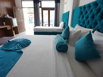 Только вернулись и эмоции свежие. Нам дали хороший номер на двух взрослых и ребёнка, две огромные кровати и одна односпальная. Номер угловой, возможно поэтому мы вообще не слышали улицу, хотя отель прямо у дороги, трафик интенсивный, все сигналят даже ночью. Чистый бассейн в тени здания, в дневной зной спасение. Очень удачно расположен по отношению к морю.