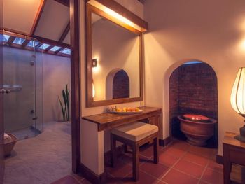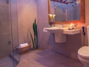 В ванной комнате оборудована клумба с цветами. Смотрится это оригинально и красиво. Но, там завелись муравьи, которые расползались по всей ванной комнате и спальне. В комнате очень мало света, было не комфортно. Интересное решение с завтраком. Один человек может есть либо сосиски, либо яичницу. И то и другое в одни руки не дают, видимо опасаются переедания :-) Ужин (шведский стол) 13$, по вкусу так себе. Ходили ужинать в кафе около выхода из отеля.