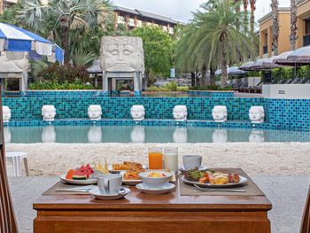 Прекрасный завтрак, нет очередей. Большой бассейн, рядом много всего: массажи, прачка, рестораны. Вайфай работает прекрасно и на территории и в номере. Персонал не заметен - оно и прекрасно