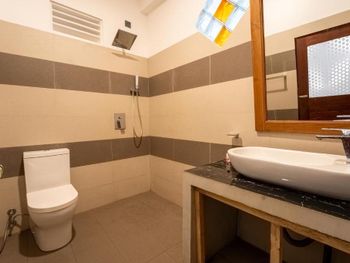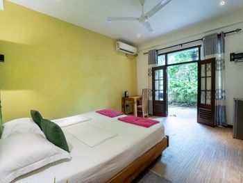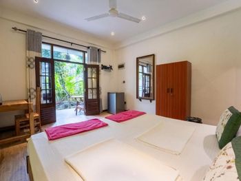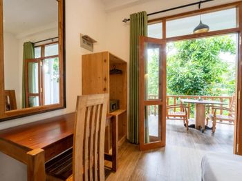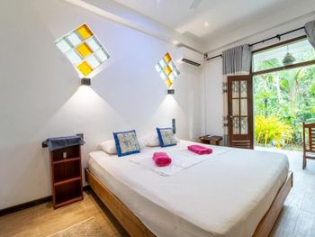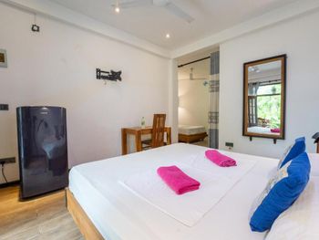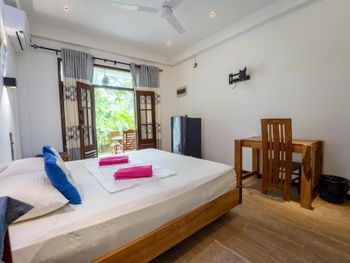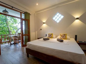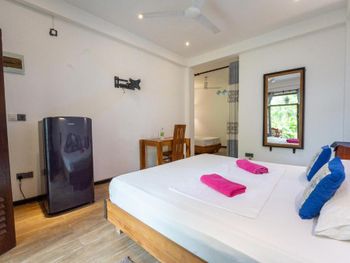 Отличный небольшой отель с очень отзывчивым хозяином и его помощником. Подсказывали и помогали нам во всем, так как мы были на Шри-ланке первый раз. Завтрак сытный (фрукты, тосты, яйца готовят в 3-х вариантах) подают в удобное для вас время на террасе. Можно заранее заказать ужин, цена ниже, чем в кафе на пляже. Расположен в джунглях на горе, вдали от шумной главной улицы. Да, идти до пляжа прилично, но по тени. Мы арендовали скутер у хозяина, поэтому проблем не было вообще, кому лень подниматься можно взять тук-тук (не дорого))) Недалеко есть пара маленьких магазинчиков. Холодильник, кондиционер, фен в номере имеются.