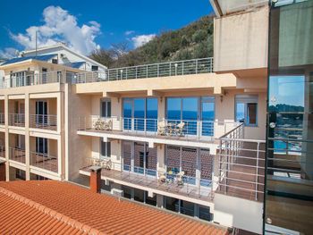 Прекрасный вид на бухту Пржно!!! Причем я проживал в номере 1 а это первый жилой уровень из 4 кажется, тем не менее вид порадовал. Думаю что выше еще лучше! Есть выход на плоскую крышу, где стоят никем не используемые пару лежаков - отличное место для запуска дрона?. Если кому то повезет жить на верхних этажах - в наличии лифт, бояться не стоит. С парковкой авто нет проблем прямо у апартаментов! До пляжа идти ровно 240м с учетом перехода через дорогу строго по зебре (можно срезать немного ?).