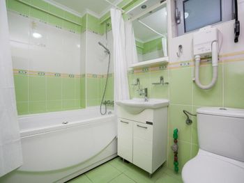 Указано, что в ванной будут средства гигиены - а на самом деле одно мыло. Полотенца не белые, а очень уже старые.