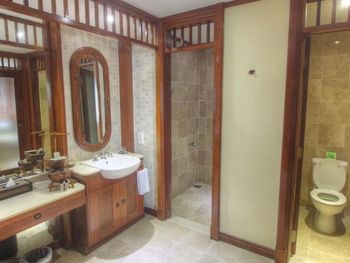 Если вам важнее в отдыхе море и возможность в нем покупаться, то это место не для вас. Вход в воду песчаный, пологий, но через метров 10-15 начинаются камни с достаточно острыми краями, которые продолжаются вглубь моря. Утром при отливе эти камни обнажаются, и, чтобы искупаться, надо каким-то образом их перейти, чтобы просто добраться до воды. Желающих это делать за все время пребывания в отеле не нашлось, т.к. перспектива покалечиться, поскользнувшись на камне, никого не прельщает. Поэтому - или бассейн, или плескаться в лужице воды, которая остается до камней при отливе. Ближе к вечеру вода прибывает (разница в уровнях около метра), поэтому появляется возможность поплавать, переплыв каменное поле или плавая над ним. Категорически не советую нырять при заходе в море с берега (камни!). И еще. Вода мутная, вытянутой руки почти не видно. Номер (деревянные домики вправо от ресторана) потрепан временем и, несмотря на видимые усилия со стороны персонала по его поддержанию в сносном виде, оставляет немного удручающее впечатление. Освещение в номере очень плохое, компрессора кондиционеров старенькие и достаточно сильно шумят, сантехника расхлябана, полы просто ужас (когда ходишь в своем номере или ходит сосед сверху, домик просто сотрясается).
