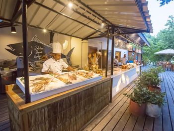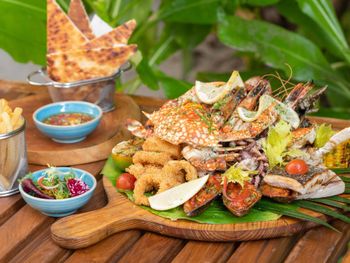 по средам на пляже устраивают барбекю с морепродуктами ( лобстер, креветки, клешни крабов, суши и прочие радости чревоугодия) довольно вкусно , на чела с вином минимум получится 110-140$, но это того стоит