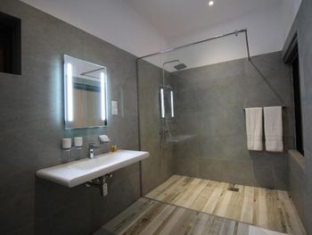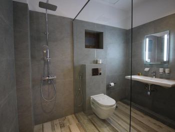 Очень тёмная, сырая и не комфортная ванная комната. Пол из многочисленных ступенек зачем-то((( Постоянно огромная лужа после душа. Нет вытяжки нормальной. Нет сушилки для одежды на балконе.