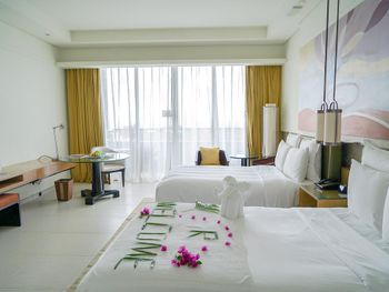 В отеле нужно брать номера категории высокого класса они лучше отремонтированы, мебель интереснее, есть тв русский канал ртр один, обязательно на рецепшне берите осушители воздуха, поскольку отель расположен в тропическом саду влажность воздуха до 100 процентов. Бассейны хорошие чистые широкие они пригодились. Очень вкусные завтраки.