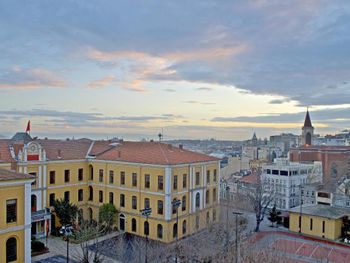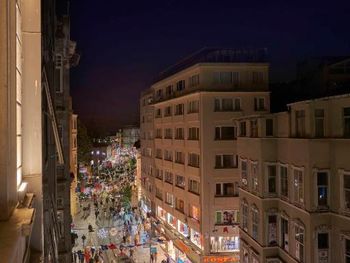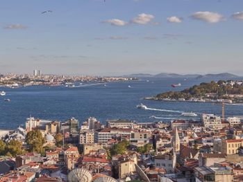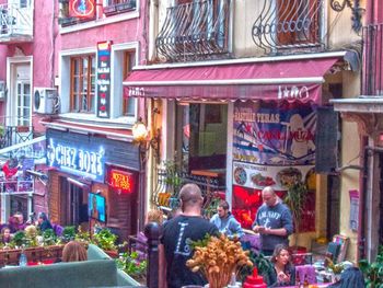 С верхних этажей хороший вид на Босфор. На улице множество ресторанов и магазинов.