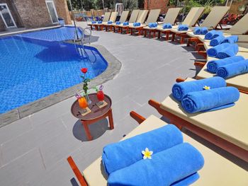 Расположение не на оживленной улице и это плюс. Раньше заселили, удобные кровати, у нас был отличный вид на горы. Хороший и чистый бассейн. Есть бильярд. Всегда есть горячая вода.