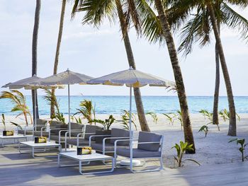 санузел с ванной и душевой кабиной, 1 большая кровать 200 х 200 см или 2 кровати 125 х 200 см, совмещенная гостиная с диваном, гардеробная, бали-кровати и шезлонги на террасе, терраса с небольшим частным бассейном и прямым доступом к океану.