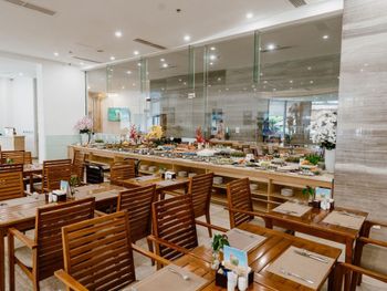 завтрак в ресторане Orhidea (06:30-09:00, шведский стол) напитки: молоко; чай: черный, зеленый, травяной, фруктовый; кофе: американо, капучино, латте, эспрессо, вьетнамский кофе; вода в стаканах; детокс; безалкогольные напитки в стаканах; сок дня: 2 вида охлажденного сока и 1 свежевыжатый
