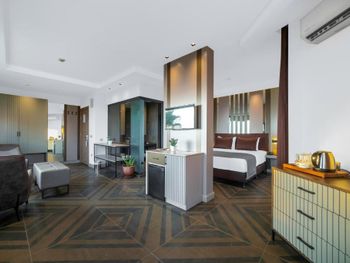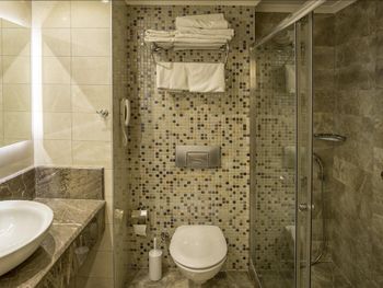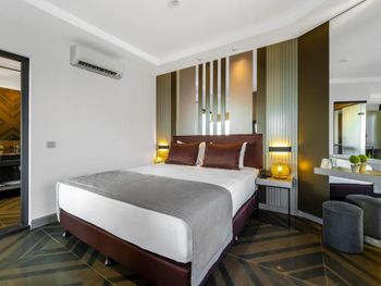 Я брал cleopatra suite - самый дорогой номер в этом отеле. При этом номер маленький, кофемашина на растворимом кофе, отвратитетельные наборы геля/шампуня/мыла. Стеклянная перегородка в санузел с щелями, исцарапаный стульчак на унитазе, . Маленькие телевизоры турецкие, без смарт тв. Лифты - малюсенькие, втроем уже с трудорм входишь, велочемодан приходилось на попа ставить.