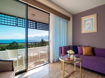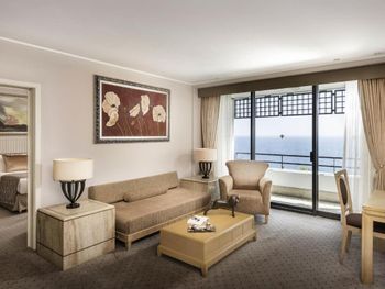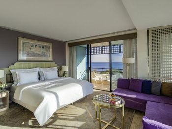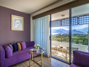 Светлые номера с собственным балконом с видом на Анталью или Средиземное море украшены роскошными тканями. В числе удобств гостиная зона с диваном и телевизор с плоским экраном и спутниковыми каналами.