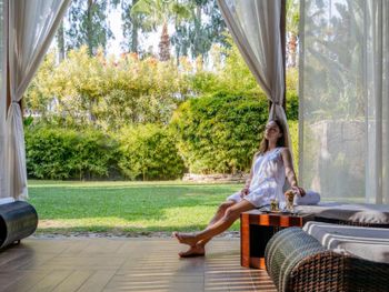 Большая территория отеля с огромными соснами, под которыми можно лежать в полутени на широких лежаках.