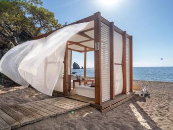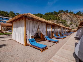 Отдохнуть на пляже так же не представляется возможным, так как люди занимают лежаки в 5:30 утра, то есть после завтрака найти свободный лежак невозможно. Людей очень много, никакой социальной дистанции на пляже нет. Вариантов 2: вип-кабинки по 250 евро за день, или расположиться на полотенце, как на диком пляже.