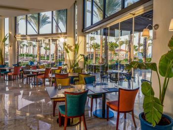 разнообразная еда в ресторане шведский стол и мороженое мовин пик - отличные бассейны, в том числе глубокий без музыки, если хотите отдохнуть в тишине - у бассейна хорошее обслуживание, официанты на роликах - лобби отеля красивое, живая музыка каждый день - номер большой, кондиционер работал хорошо, в ванной и душевая кабина и ванна - есть доступ в соседний семейный отель и аквапарк - нет детей