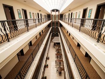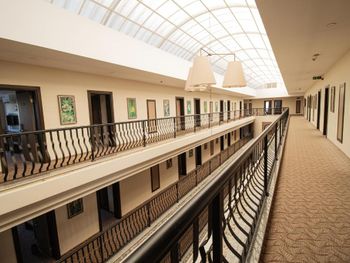 Вид на этажи при выходе из комнаты и тихоиграющая музыка на фоне. Сытный завтрак хоть и посредственный.