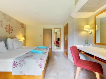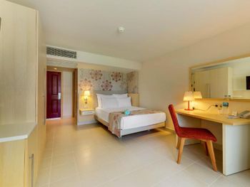 Совершенно не стоит своих денег. Он в целом не плох, но не за те деньги, что за него просят. Про номера: Отель- старый, уставший. Номера маленькие, темные, изношенные. В номерах нет ни напитков, ни чайника. Туалетные принадлежности обновляют через раз. Настроить кондиционер и выставить желаемую температуру нельзя- необходимо звонить на ресепшн)) при этом температура автоматически меняется во всех номерах отеля Про рестораны: В основном ресторане все столы расположены на улице (соответственно, кондиционеров нет, есть только вентиляторы) - можете представить насколько "приятно" там обедать и ужинать в летнюю жару. Официанты не успевают убирать столы после гостей, столов на всех не хватает. Есть небольшой ресторан на пляже с кондиционером, но там скудный и однообразный выбор еды. Ресторан турецкой кухни- сплошное недоразумение. Тебя сажают за стол с рандомными людьми и не дают сесть за свободный стол...кстати, там тоже нет кондиционера. Про пляж: Классика: все забивают лежаки полотенцами и своими вещами, так что после 10 найти место на пляже невозможно Ну и вишенка на торте- будьте осторожны в бассейне, можно поранить пальцы)