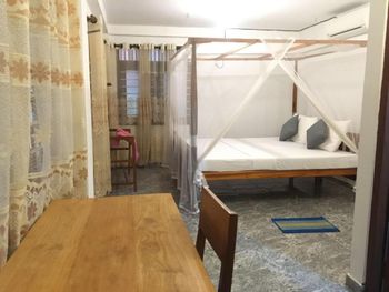 Понравилось хорошее расположение- удаленность от шума улицы с мотоциклами и авто и в тоже время близкая доступность пляжа, буквально в трёх минутах через Hot Rock Restaurant, в котором можно позавтракать и пообедать, который расположен прямо на берегу океана и оснащён шезлонгами и зонтиками. Номера с 27 по 33 расположены на горе и с них открывается вид на океан и пальмы, на балкон периодически наведываются чёрные длиннохвостые обезьяны, они не агрессивные и их интересует исключительно еда, мы их кормили с рук.Хозяева апартаментов очень положительные люди, у нас был ранений прилёт и вместо регламентирует оно времени 14 часов, нас заселили в 8 часов утра, в номере работало все- кондиционер, вентилятор, вода была и холодная и очень горячая тоже и с хорошим напором, кровать закрыта балдахином от комаров, комары были на балконе, но совсем в небольшом количестве. Прочитали в отзывах об муравьях в номере поэтому привезли с собой совсем немного порошка производства братской Польши и никаких муравьев не видели вообще.